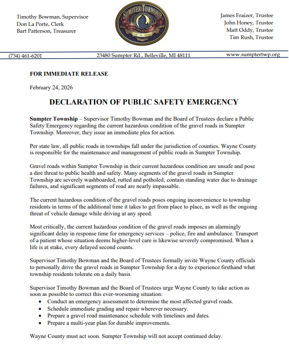 Sumpter Township – Supervisor Timothy Bowman and the Board of Trustees declare a Public