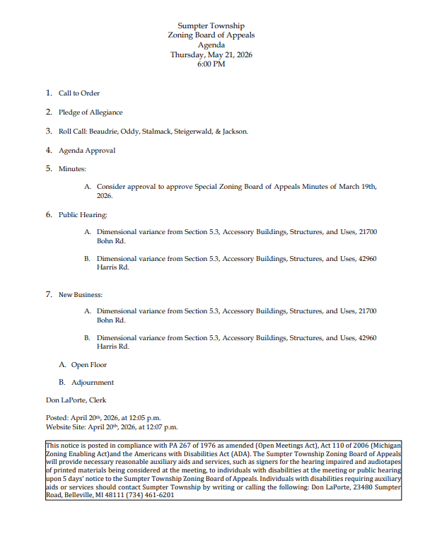 Zoning Board of Appeals May 21st, 2026 Public Hearing Notice