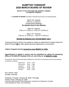 Like us on Facebook! https://www.facebook.com/sumptertownship (ACTIVE LINK ON OUR HOMEPAGE)