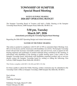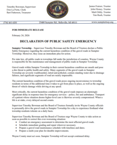 FOR IMMEDIATE RELEASE February 24, 2026 DECLARATION OF PUBLIC SAFETY EMERGENCY Sumpter Township – Supervisor…