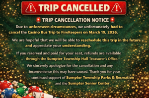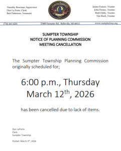SUMPTER TOWNSHIPNOTICE OF PLANNING COMMISSIONMEETING CANCELLATION The Sumpter Township Planning Commission originally scheduled for; 6:00 p.m.,…