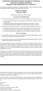 SUMPTER TOWNSHIP ZONING BOARD OF APPEALSNOTICE OF PUBLIC HEARINGREQUEST FOR DIMENSIONAL VARIANCE The Sumpter Township…