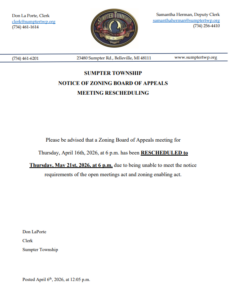 SUMPTER TOWNSHIP NOTICE OF ZONING BOARD OF APPEALS MEETING RESCHEDULING Please be advised that…