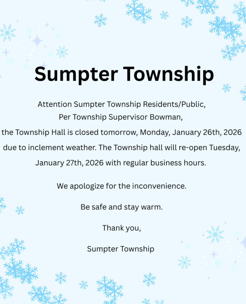 Per Supervisor Bowman, the Township Hall is closed tomorrow, Monday, January 26th, 2026 due to inclement weather. The Township hall will re-open Tuesday, January 27th, 2026 with regular business hours.
